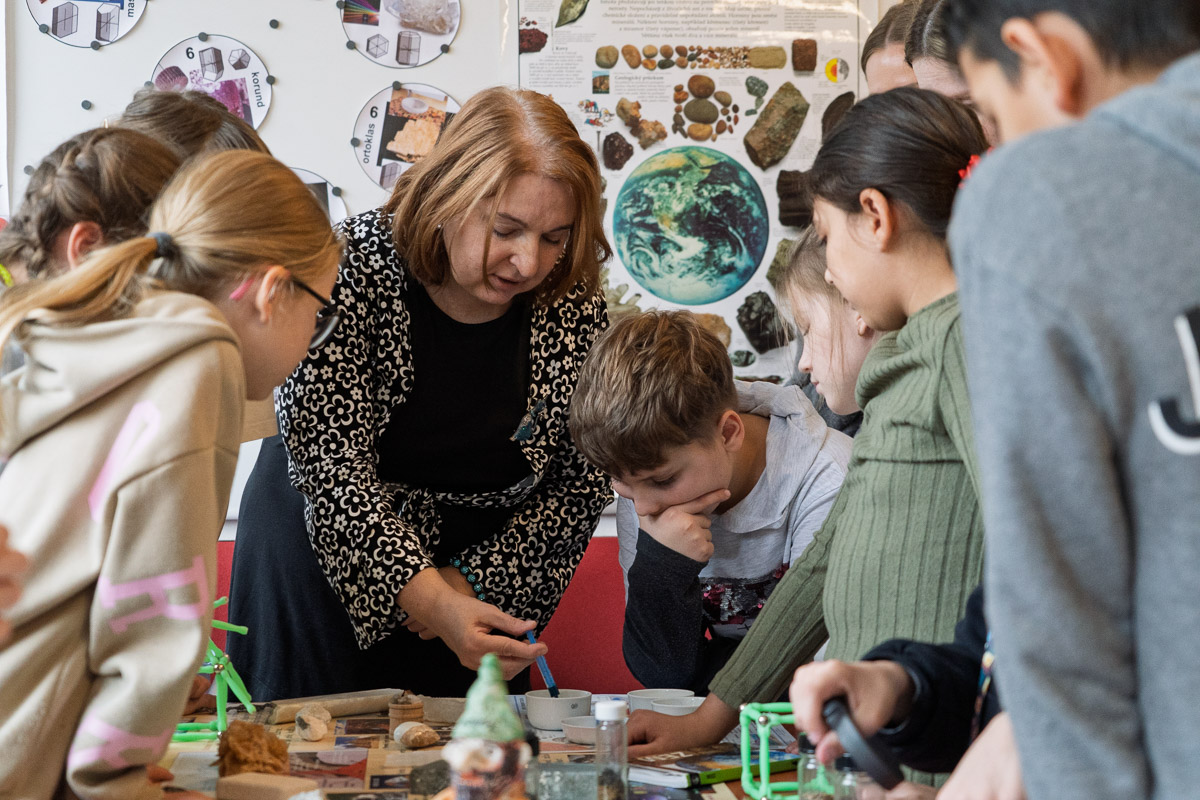 Ústav geotechniky SAV, v. v. i., predstavil žiakom tretích a štvrtých ročníkov základných škôl rozmanité druhy minerálov, hornín a rúd tvoriacich nerastné bohatstvo Slovenska. V rámci prednášok mali žiaci možnosť pozorovať farebné zmeny fluorescenčných minerálov pri ich vystavení ultrafialovému žiareniu a vytvoriť si aj kryštály minerálov rozmanitých tvarov a farieb.