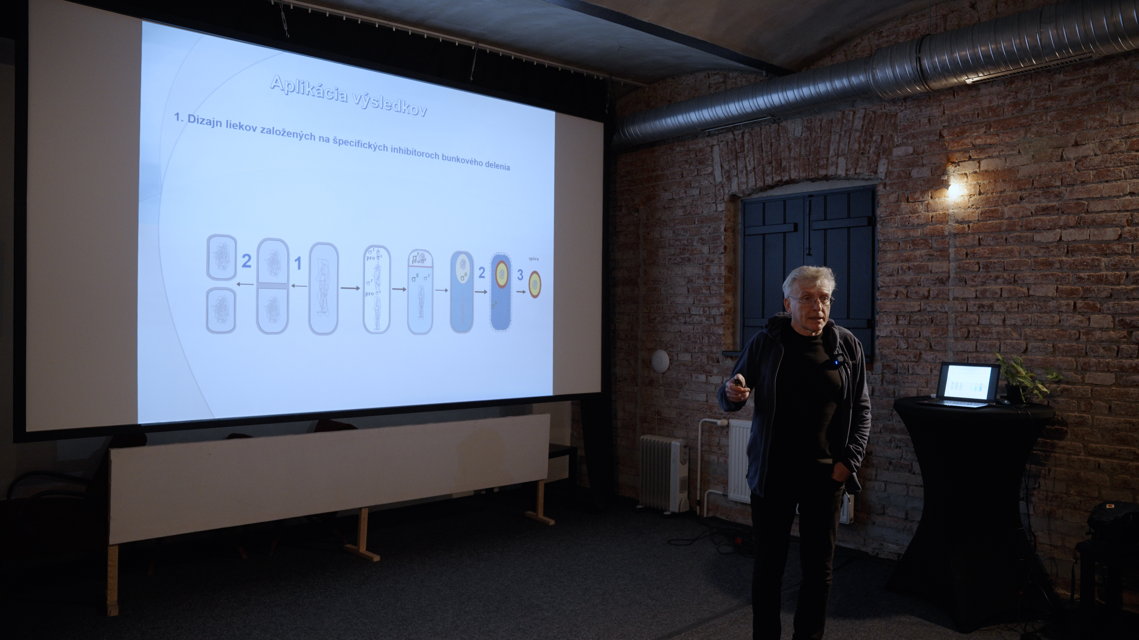 Prednáška priblížila neobyčajný svet baktérií, najmä modelového mikroorganizmu Bacillus subtilis, ktorý vedci používajú na skúmanie základných procesov života. Hoci ide o mikroskopický organizmus žijúci bežne v pôde, jeho schopnosti sú prekvapivo komplexné. Baktéria dokáže napríklad presne „rozhodnúť“, kde sa má bunka rozdeliť, ako reagovať na nedostatok živín či ako prežiť nepriaznivé podmienky vytvorením mimoriadne odolnej spóry. Práve procesy ako bunkové delenie, diferenciácia a sporulácia sú predmetom dlhoročného výskumu tímu Imricha Baráka.