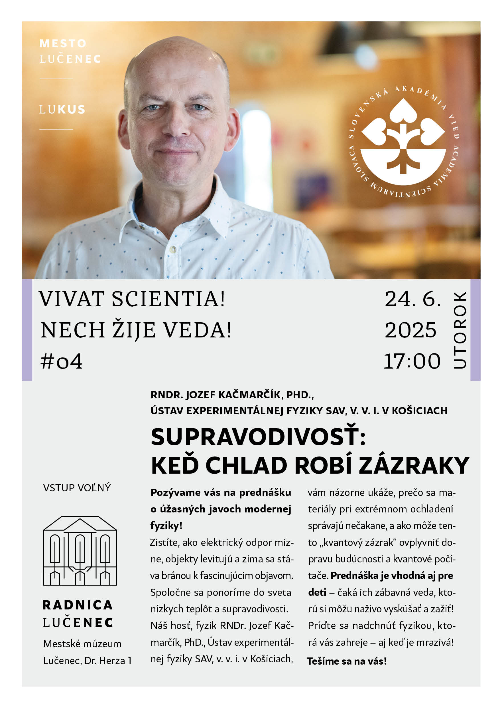 Pozývame Vás na poslednú predprázdninovú prednášku SAV zo série Vivat Scientia! Nech žije veda! V utorok 24. júna 2025 o 17.00 sa v Radnici Mestského múzea Lučenec predstaví fyzik dr. Jozef Kačmarčík z Ústavu experimentálnej fyziky SAV, v. v. i. v Košiciach. Svoju prednášku doplní o viaceré pozoruhodné experimenty, preto je vhodná aj pre mladšie publikum. Vstup je voľný.
