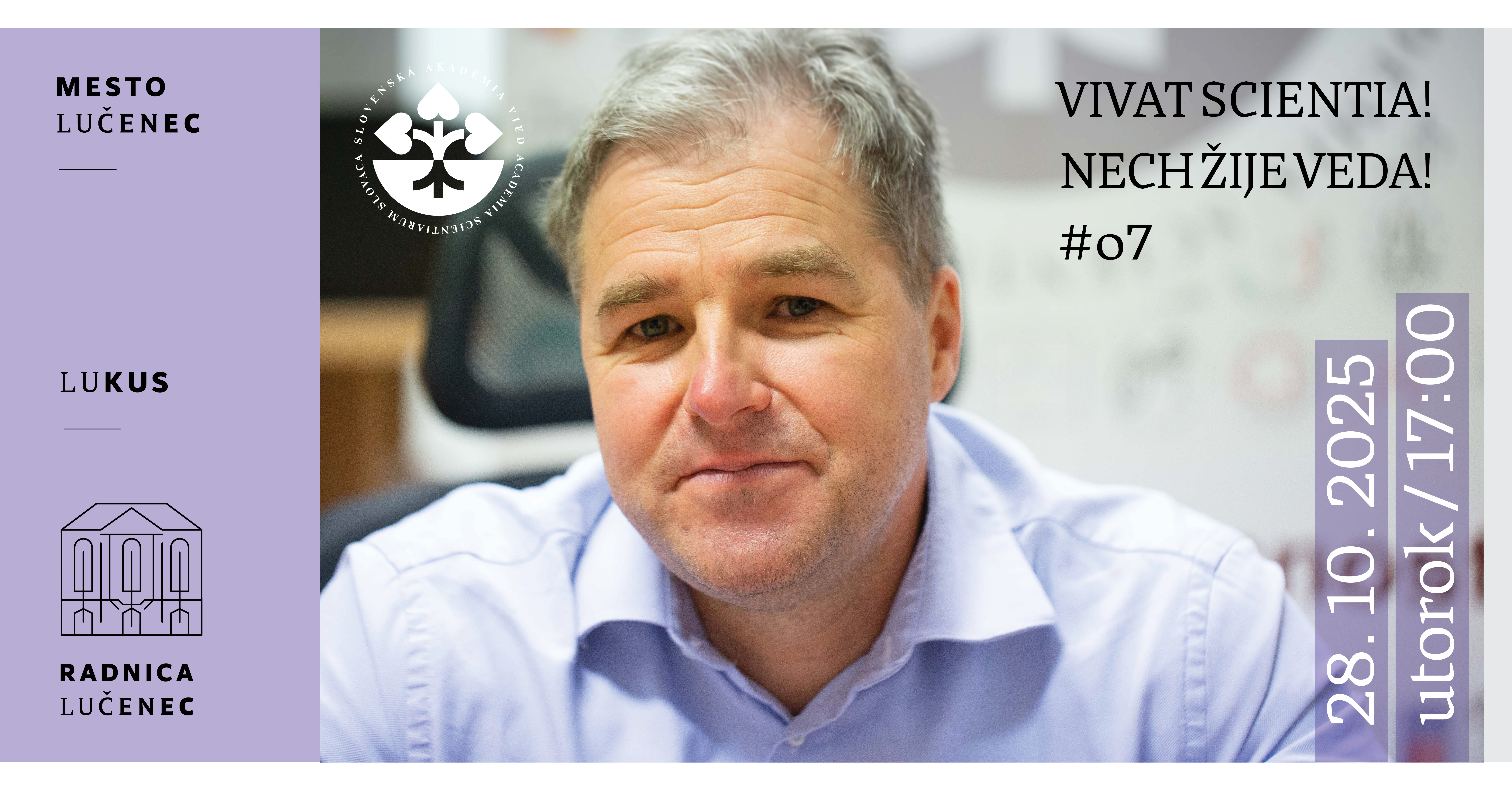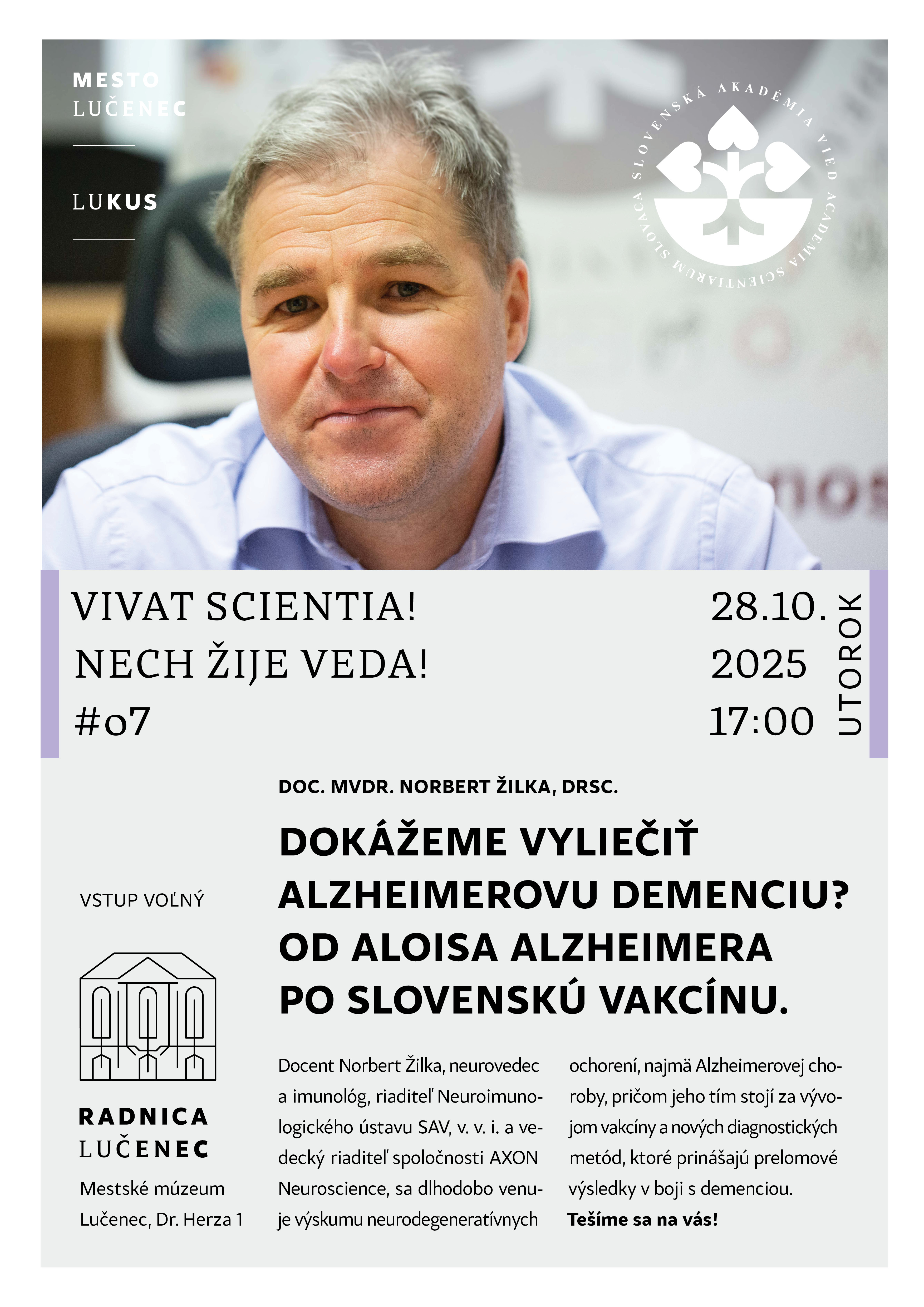 Pozývame Vás na ďalšiu prednášku série Vivat Scientia! Nech žije veda!, ktorá sa uskutoční v utorok 28. októbra 2025 o 17.00 h v Radnici Mestského múzea Lučenec. Publiku sa predstaví doc. Norbert Žilka, riaditeľ Neuroimunologického ústavu SAV, v. v. i. Vstup je voľný.